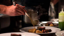 oxfilé med pepparsås, confiterad potatisfondant, smörpocherad svartrot och svartkål
